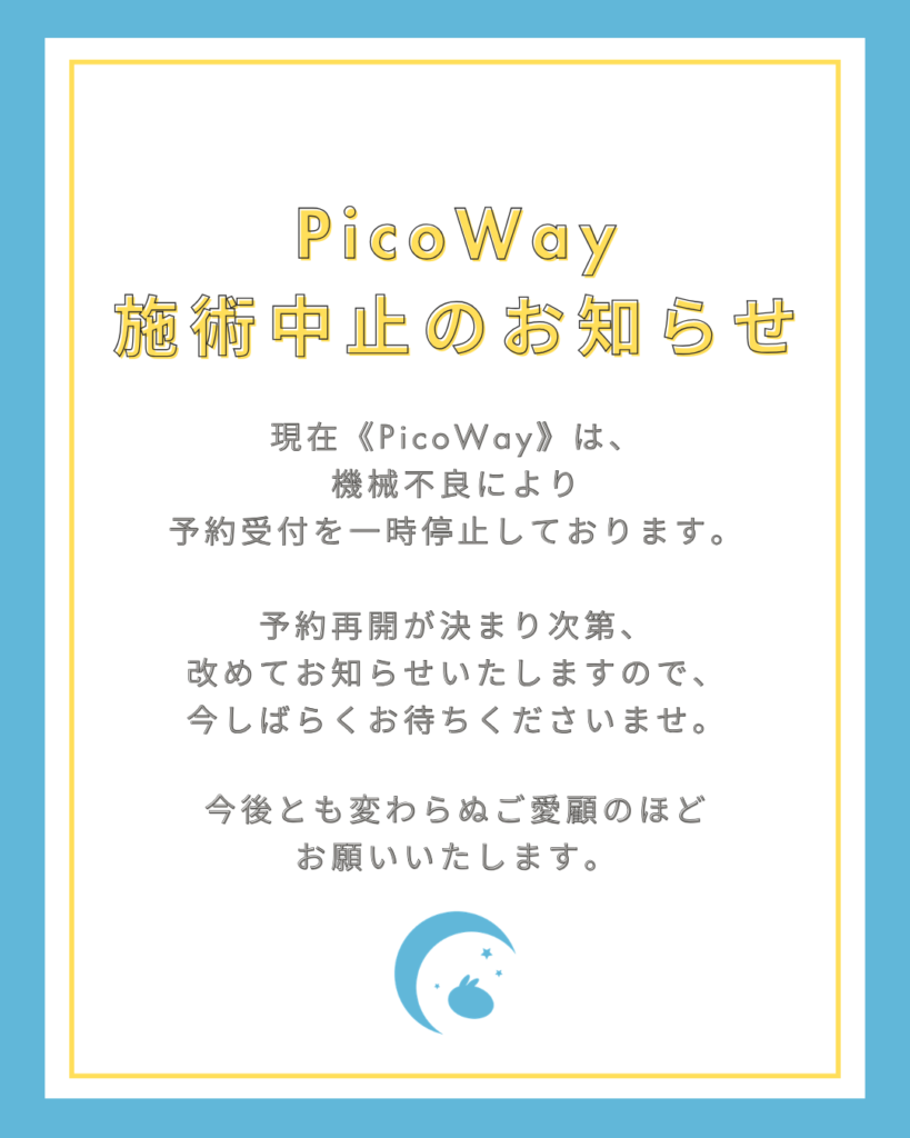 PicoWay施術中止のお知らせ 2026.04.23 平素よりツキミ形成外科美容クリニックをご利用いただきありがとうございます。 現在《PicoWay》は、機械不良により予約受付を一時停止しております。
